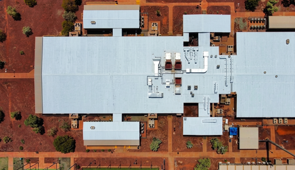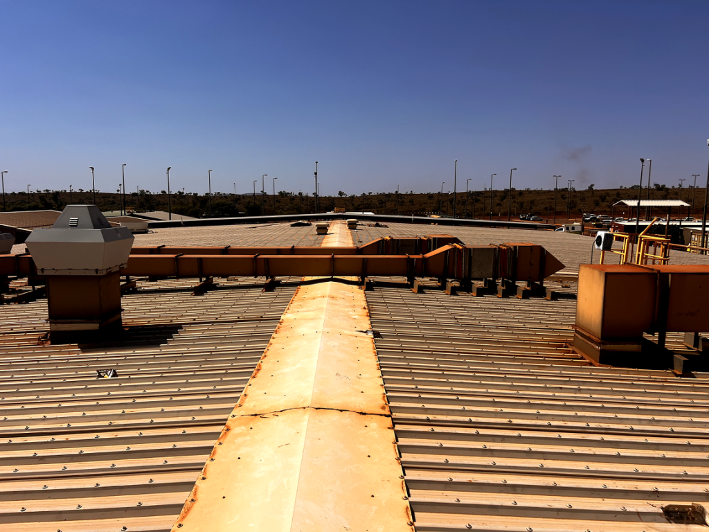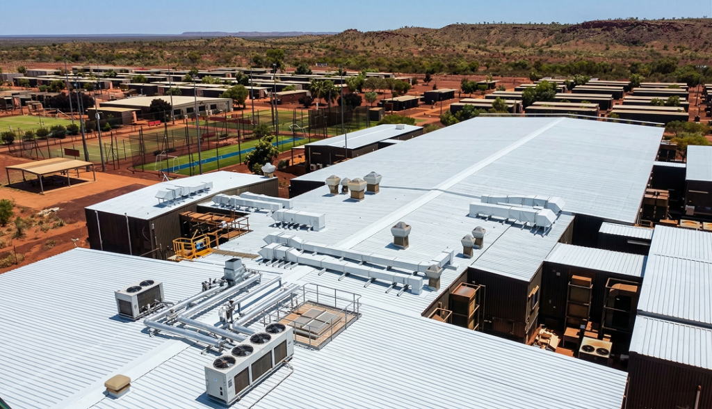 The Rio Tinto Hope Downs 4 mess and commercial kitchen facility in the Pilbara, Western Australia, faced a compound heat problem due to the region’s extreme climate. The metal roof routinely exceeded 60° driving significant heat into the dining areas and requiring HVAC systems to run constantly to maintain comfort. Additionally, the facility suffered from water ingress, corrosion at fasteners and joints, and high energy demand leading to increased Scope 1 emissions. To address these challenges, Powerhouse Renewables Group implemented a high-performance thermal insulation and waterproofing solution during a three-day application in December 2024.